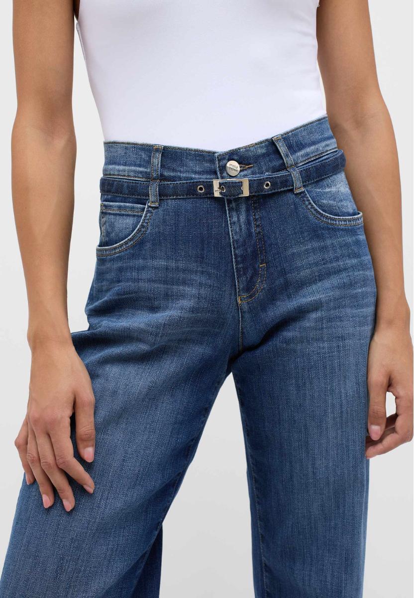 Angels jeans. Model LIZ BELT. Stof 350. Pasvorm 2565. Kleur 3358 jeans blauw. Deze denim heeft een hoge taille en rechte, wijde pijpen voor een flatterend en trendy silhouet.